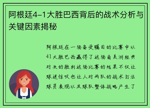 阿根廷足球在全球范围内享有盛誉,是足球历史中不可忽视的重要力量。从20世纪的传奇球员马拉多纳到如今的梅西,阿根廷足球屡次在世界杯、美洲杯等国际大赛中赢得辉煌战绩,取得了世界范围的关注和崇拜。究竟是什么因素推动了阿根廷足球的崛起?本文将从四个方面详细探讨阿根廷足球成功的秘诀与背后深层的因素,包括:足球...